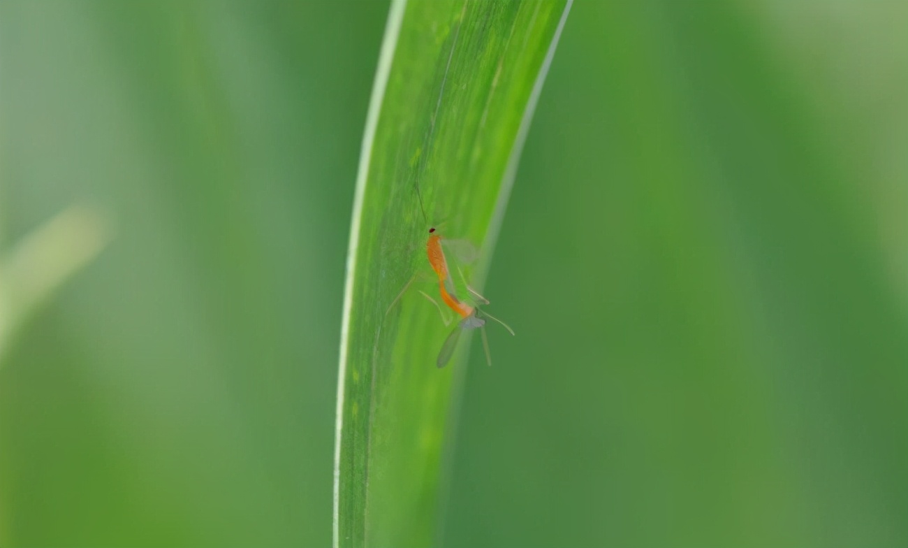 麦红吸浆虫雌成虫体长2~2.5mm,翅展5mm左右,体桔红色。前翅透明,有4条发达翅脉,后翅退化为平衡棍。触角细长,14节,雄虫每节中部收缩使各节呈葫芦结状,膨大部分各生一圈长环状毛。雌虫触角呈念珠状,上生一圈短环状毛。雄虫体长2mm左右。卵长0.09mm,长圆形,浅红色。幼虫体长约体长3~3.5毫米,椭圆形,橙黄色,头小,无足,蛆形,前胸腹面有1个“Y形”剑骨片,前端分叉,凹陷深。蛹长2mm,裸蛹,橙褐色,头前方具白色短毛2根和长呼吸管1对。