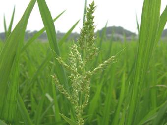属禾本科一年生草本植物。别名芒早稗、水田草、水稗草等。秆丛生,基部膝曲或直立,株高50—130cm。叶片条形,无毛;叶鞘光滑无叶舌。圆锥花序稍开展,直立或弯曲;总状花序常有分枝,斜上或贴生;小穗有2个卵圆形的花,长约3mm,具硬疣毛,密集在穗轴的一侧;颖有3—5脉;第一外稃有5—7脉,先端具5—30mm的芒;第二外稃先端具小尖头,粗糙,边缘卷孢内样。颖果米黄色卵形。种子繁殖。种子卵状,椭圆形,黄褐色。