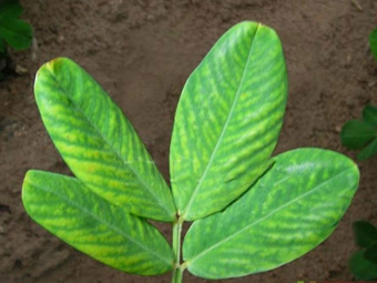 3、花生矮化病毒病(PSV),属黄瓜花叶病毒组。病株顶端叶片脉淡并出现褪绿斑,叶片呈浅绿与绿色相间的典型普通花叶症状,病叶沿叶脉出现辐射状绿色小条斑和斑点。叶片变窄,叶缘波状扭曲。病植株中度矮化,大量出现小果荚,减产严重,其危害重于前两者