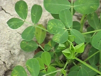 2、花生黄花叶病毒病 病原为黄瓜花叶病毒(CMV),属黄瓜花叶病毒组。病株顶端叶片出现褪绿黄斑,叶片卷曲成典型黄花叶状,上有网状明脉和绿色条纹,植株中度矮化。
