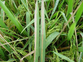 在空气潮湿时,病叶上的新鲜病斑上,有时甚至在未表现病斑的叶缘上分泌出湿浊状的水珠或蜜黄色菌胶,干涸后结成硬粒,容易脱落。在籼稻上的白叶枯病斑多半呈黄色或黄绿色,在粳稻上则为灰绿至灰白色。在感病品种上,初起病斑呈开水烫过的灰绿色,很快向下发展为长条状黄白色,在我国南方稻区一些高感品种上发生凋萎型白叶枯病,主要发生在秧苗生长后期或本田移植后1~4星期内,主要特征为“失水、青枯、卷曲、凋萎”,形似螟害枯心。诊断方法,将枯心株拔起,切断茎基部,用手挤压,如切口处溢出涕状黄白色菌脓,即为本病。如为螟害枯心,可见有虫蛀眼。