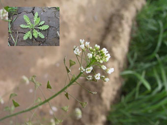 茎直立,有分枝,高20—50cm。基生叶莲座状,大头羽状分裂;茎生叶狭披针形至长圆形,基部抱茎,边缘有缺刻或锯齿。总状花序顶生或腋生;花瓣4,白色。短角果,倒心形。