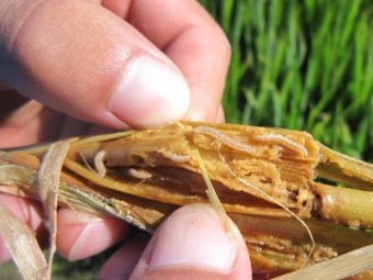 二化螟俗称钻心虫,不同时期的水稻受害,出现不同的症状。分蘖期的水稻受害,出现枯心苗和枯鞘;孕穗期会导致枯孕穗;抽穗期受害也会导致白穗;为害灌浆、乳熟期水稻,造成半枯穗和虫伤株。二化螟的幼虫在水稻叶鞘内取食,造成枯鞘,随着虫龄的增大,幼虫开始驻食心叶和茎杆。