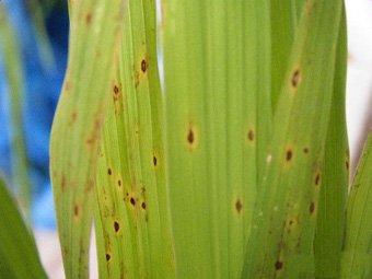 潮湿条件下,死苗产生黑绒状霉层,成株受害,初期为褐色小点,逐渐扩大,病斑周围有黄色晕圈,后期病斑边缘为褐色,中央呈现黄褐色或灰白色。