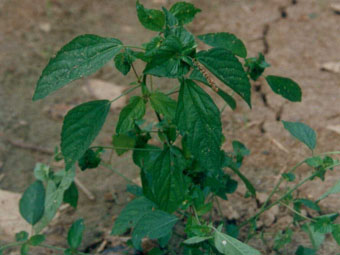 一年生草本植物,高20~60cm,被柔毛。茎直立,多分枝。叶互生,卵状菱形或卵状披针形,边缘有钝齿,长2.5~8cm,宽1.5~3.5cm,顶端渐尖,基部楔形,两面有疏毛或无毛,叶脉基部3出;叶柄长,花序腋生,有叶状肾形苞片1~3,不分裂,合对如蚌;通常雄花序极短,穗状,着生在雌花序上部,雄花萼4裂,雄蕊8;雌花序藏于对合的叶状苞片内,所以叫“海蚌含珠”。果小,蒴果钝三棱形,淡褐色,表面有毛。种子黑色。花期5~9月,果期7~11月。生于山坡、草地、沟边、路旁及耕地土中。