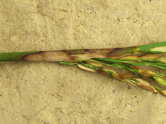 主要危害叶鞘,也可危害叶片。严重时,可深入茎秆内部引起植株倒伏。在抽穗前如严重发生,可造成植株不能正常抽穗而出现“胎里死”;当菌丝蔓延至穗顶,可造成瘪谷,有时形成白穗,甚至引起植株枯死。