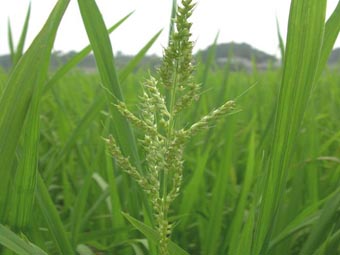 属禾本科一年生草本植物。别名 芒早稗、水田草、水稗草等。秆丛生,基部膝曲或直立,株高50—130cm。叶片条形,无毛;叶鞘光滑无叶舌。圆锥花序稍开展,直立或弯曲;总状花序常有分枝,斜上或贴生;小穗有2个卵圆形的花,长约3mm,具硬疣毛,密集在穗轴的一侧;颖有3—5脉;第一外稃有5—7脉,先端具5—30mm的芒;第二外稃先端具小尖头,粗糙,边缘卷孢内样。颖果米黄色卵形。种子繁殖。种子卵状,椭圆形,黄褐色。