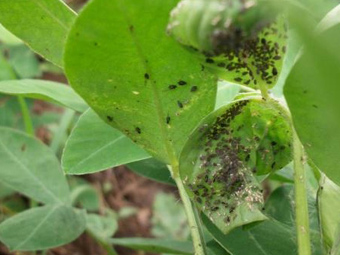 花生自出土到收获,均可受蚜虫为害,但以初花期前后受害最重。蚜虫多集中在嫩茎、花瓣、花萼管,以及果针上为害。受害严重时,花生生长停滞,叶片卷曲,变小变厚,影响叶片的光合作用和开花结实,蚜虫发生猖獗后,整棵花生的枝叶发黑(群众称淌油,)结荚甚少,成果秕,甚至枯萎死亡。