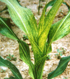 玉米整个生育期均可发病,苗期受害重,抽雄前为感病阶段。最初在心叶基部叶脉间出现许多椭圆形褪绿小点或斑纹,沿叶脉排列成断续的长短不—的条点,病情进一步发展,叶片上形成较宽的褪绿条纹,尤其新叶上明显,叶绿素减少,叶色变黄,组织变硬,质脆易折断,有的从叶尖、叶缘开始,出现紫红色条纹,最后干枯。一般第一片病叶失绿带沿叶缘由叶基向上发展成倒“八”字形,上部出现的病叶待叶片全部展开时,即整个成为花叶。病株黄弱瘦小,生长缓慢,株高不到健株一半,多数不能抽穗而早死,少数病株虽能抽穗,但穗小,籽粒少而秕瘦。病株根系发育弱,易腐烂。