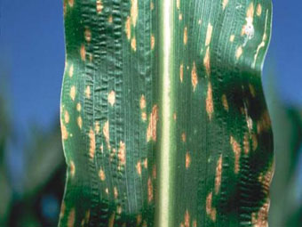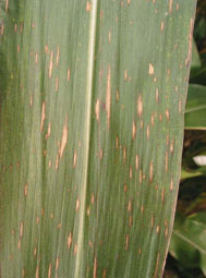 主要发生在叶部,故统称叶斑病。发生地区以温度较高、湿度较大的丘陵区为主。此病除危害叶片、苞叶和叶鞘外,对雌穗和茎秆的致病力也比大斑病强,可造成果穗腐烂和茎秆断折。其发病时间,比大斑病稍早。发病初期,在叶片上出现半透明水渍状褐色小斑点,后扩大为5-16*2-4毫米大小的椭圆形褐色病斑,边缘赤褐色,轮廓清楚,上有二、三层同心轮纹。病斑进一步发展时,内部略褪色,后渐变为暗褐色。天气潮湿时,病斑上生出暗黑色霉状物(分生孢子盘)。叶片被害后,使叶绿组织常受损,影响光合机能,导致减产。
