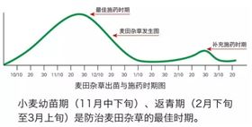 冬小麦除草剂最佳施药期为:小麦幼苗期(11月中下旬),以及返青期(2月下旬至3月上旬)。具体情况如下图:(横轴为日期)